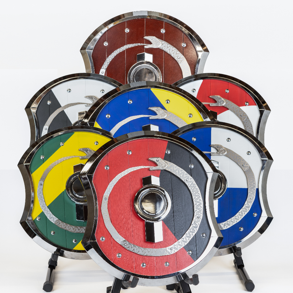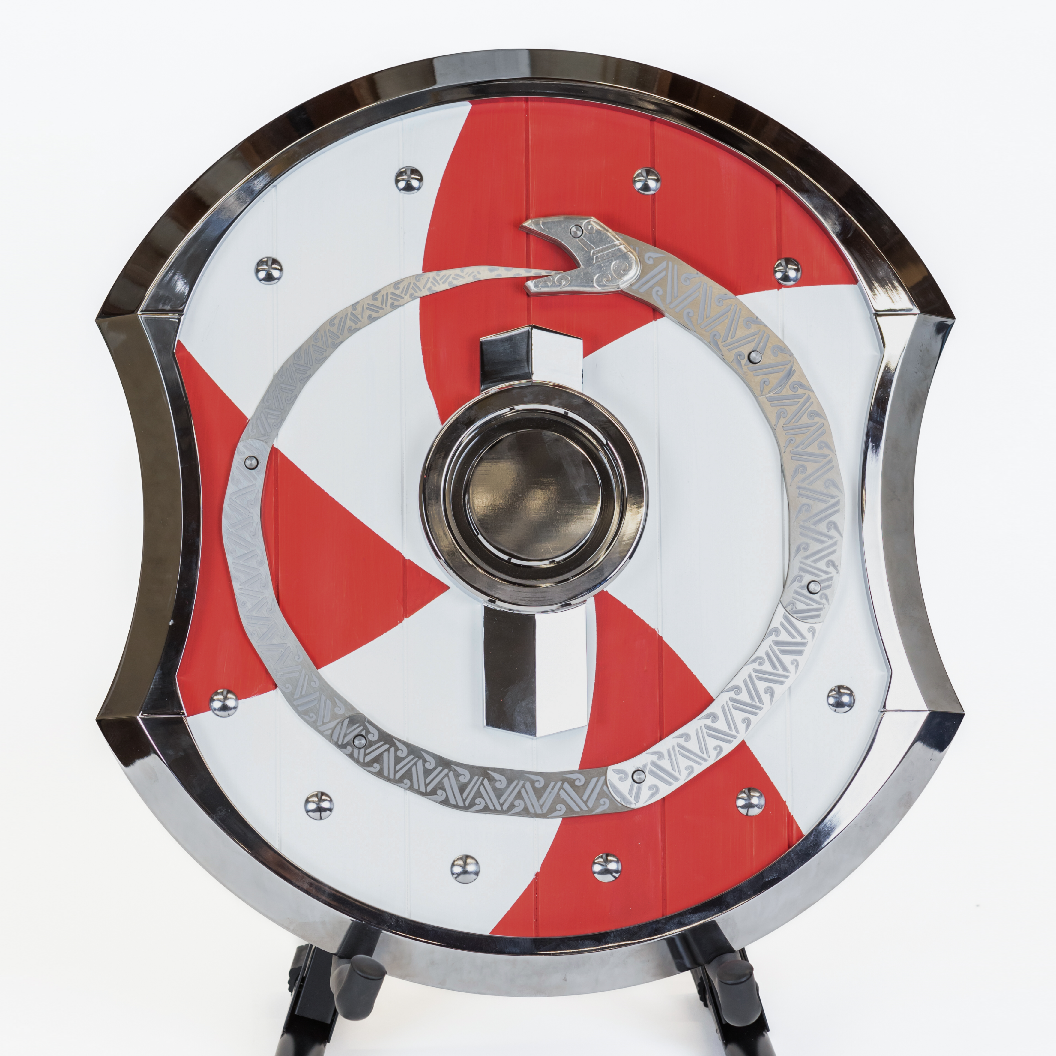 Sturdy construction of steel, wood, chrome-plated aluminum, and an etched Jörmungandr emblem with a cast pewter head.